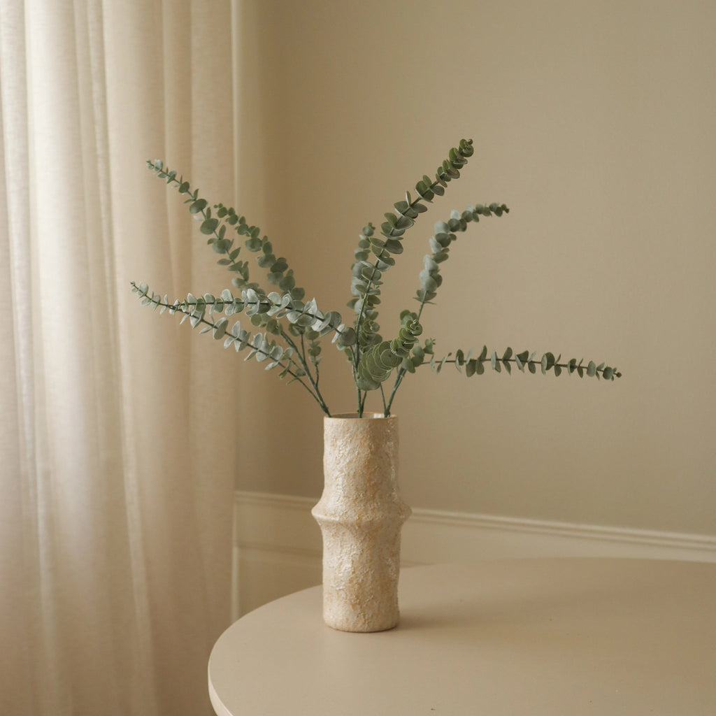 Der Botané Eukalyptus Zweig Grün zeichnet sich durch kleine, rundliche Blätter in einem gedeckten Grünton mit leicht strukturierter Oberfläche aus. Die Blätter sind entlang schlanker, grüner Stiele angeordnet, die eine Höhe von 74 cm erreichen und eine matte Oberfläche mit sichtbarer Blattstruktur aufweisen.