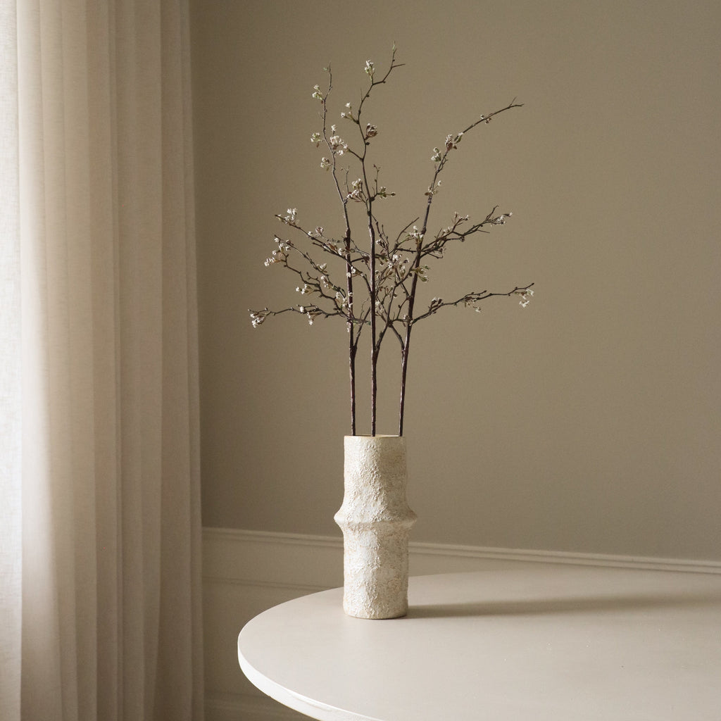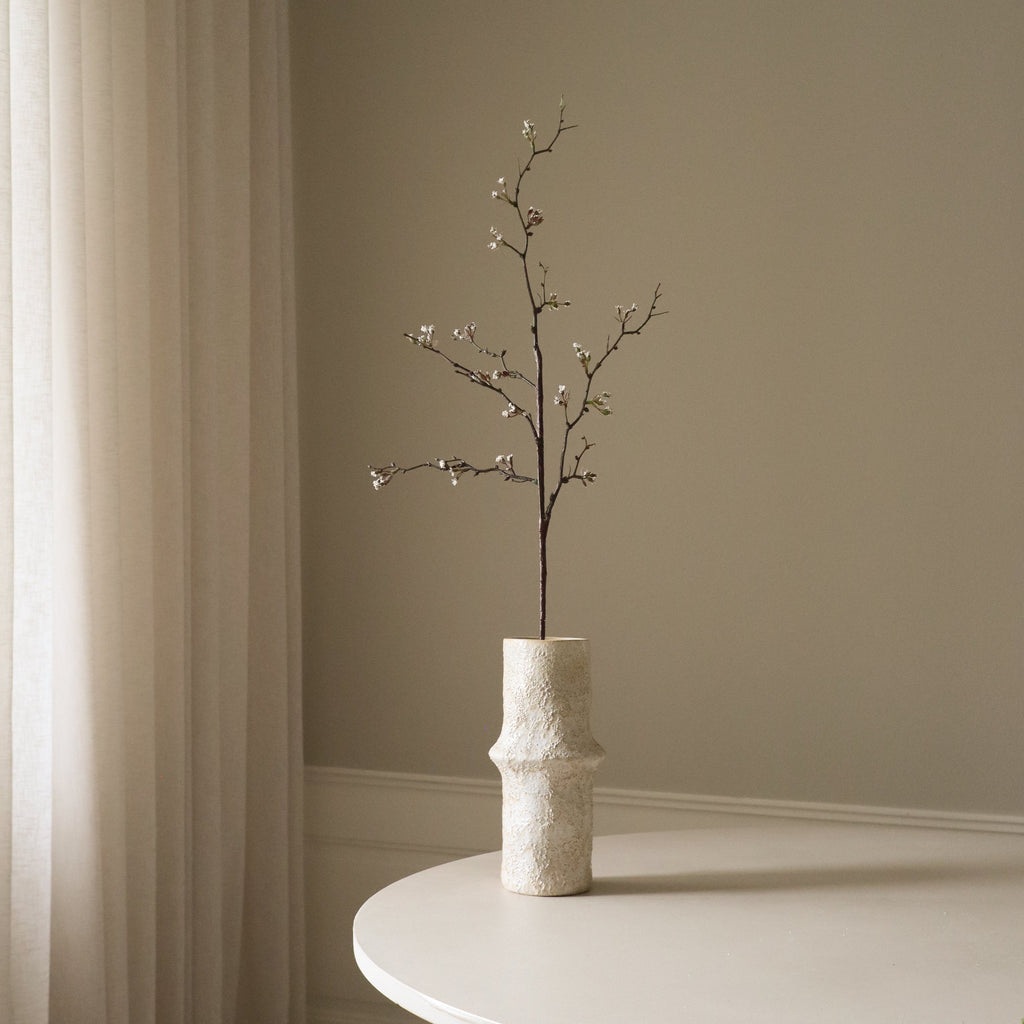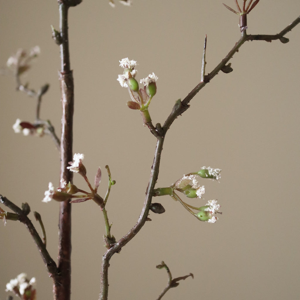 Der Botané Kirschblüten Zweig Weiß besticht durch zarte, weiße Blüten mit dezenten grünen Knospen auf dunklen, schlanken Stielen. Die strukturierten Äste schaffen eine natürliche, luftige Silhouette, während kleinere Seitentriebe Tiefe und Bewegung ins Arrangement bringen. Die dunkelbraunen, texturierten Stiele erreichen eine Höhe von 96 cm – perfekt für Sträuße, Gestecke oder als dekorativer Blickfang in deinem Zuhause.