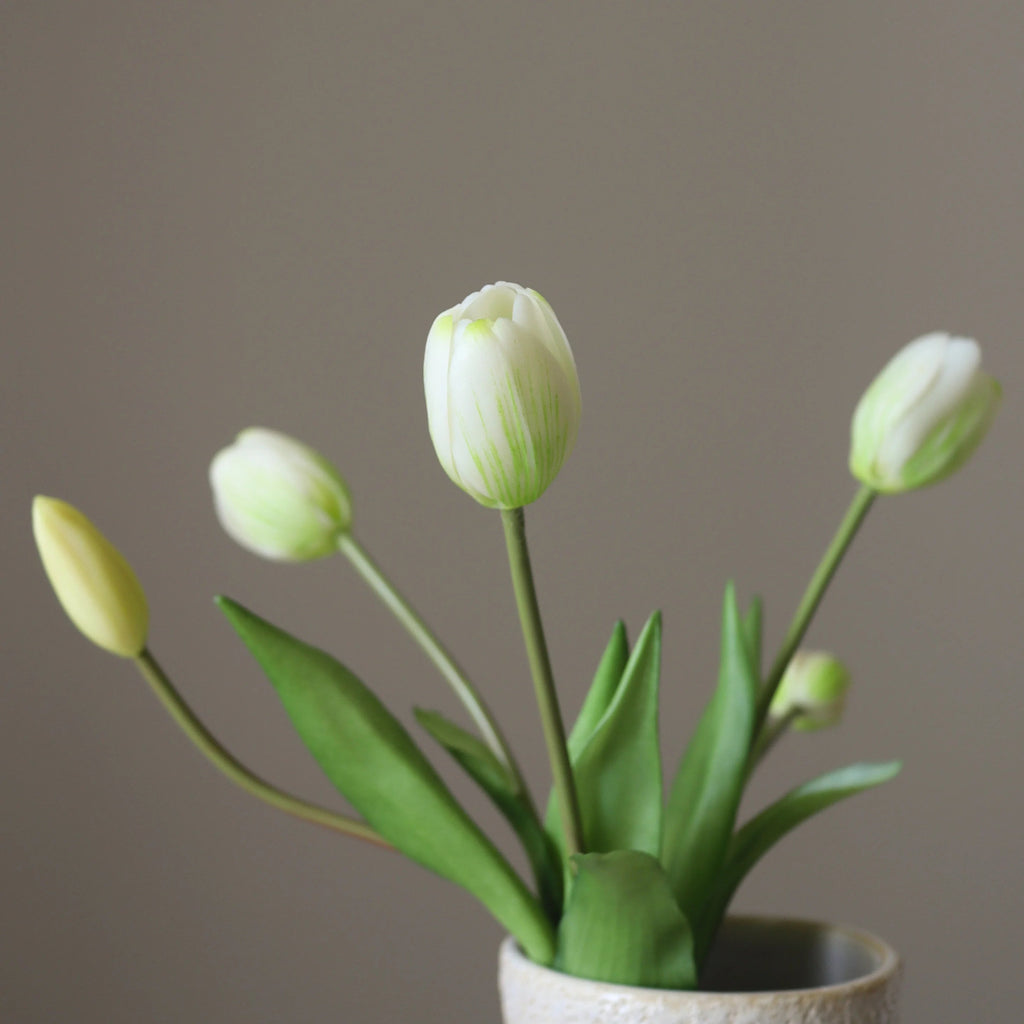 Dieses elegante Botané Tulpen-Bouquet Weiß besteht aus 5 zarten weißen Tulpen mit sanft geschwungenen Blütenblättern und schlanken grünen Stielen. Die subtilen Farbnuancen und die natürliche Bewegung der Blüten verleihen dem Arrangement Leichtigkeit und zeitlose Eleganz. Mit einer Höhe von ca. 39 cm lässt sich das Bouquet perfekt in Vasen platzieren, die Stiele sind jedoch flexibel und können individuell gebogen werden, um Höhe und Form nach Wunsch anzupassen.