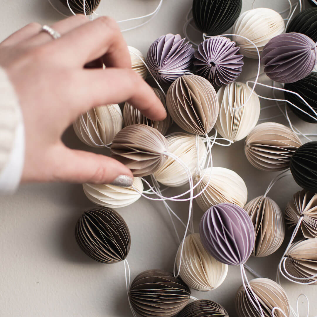 Du kannst z. B. mehrere Papier-Ostereier an einem Ast aufhängen. Das ergibt eine tolle Tischdeko. Oder du arrangierst sie auf einem Tablett oder in einer Schale mit anderer Deko. Probier dich einfach aus!