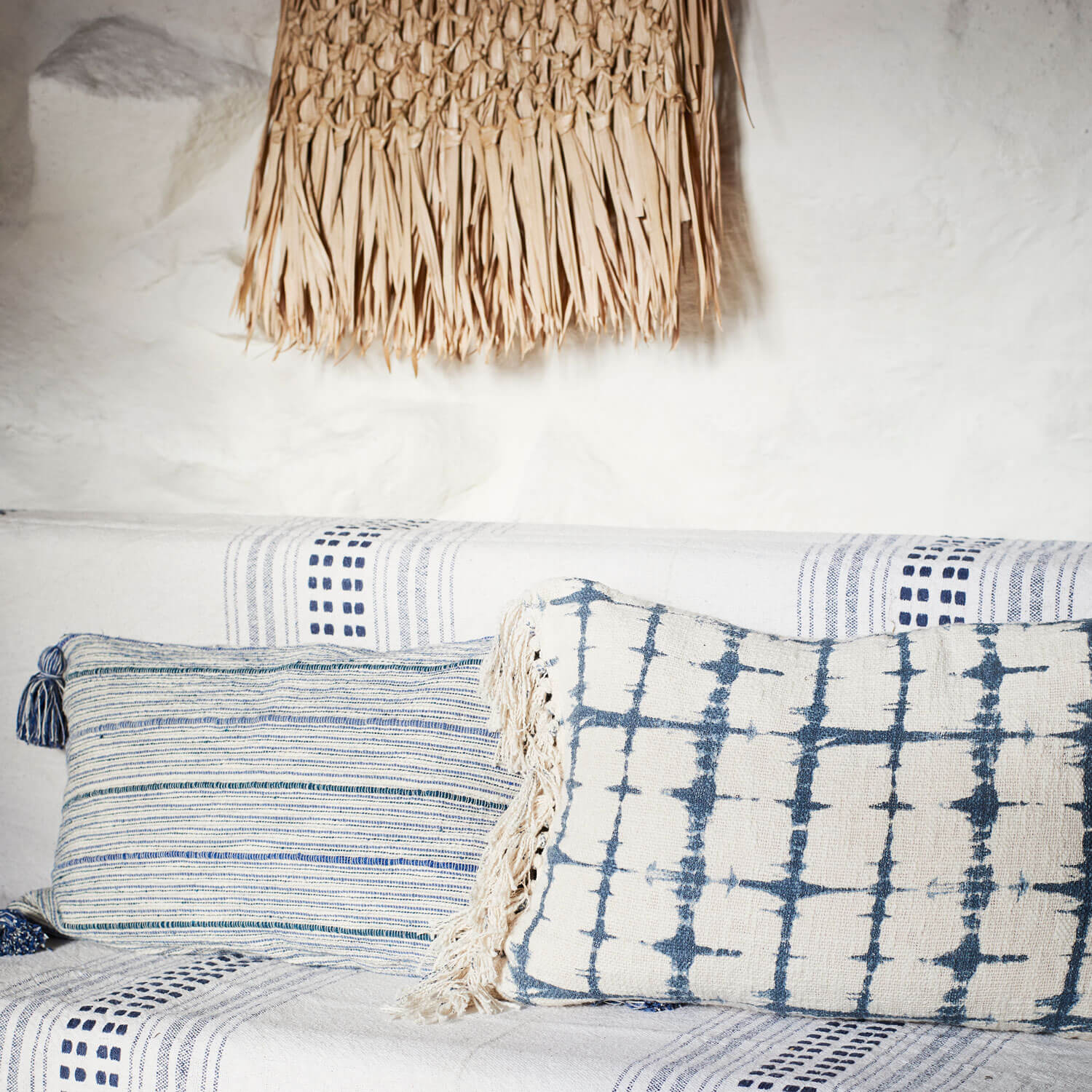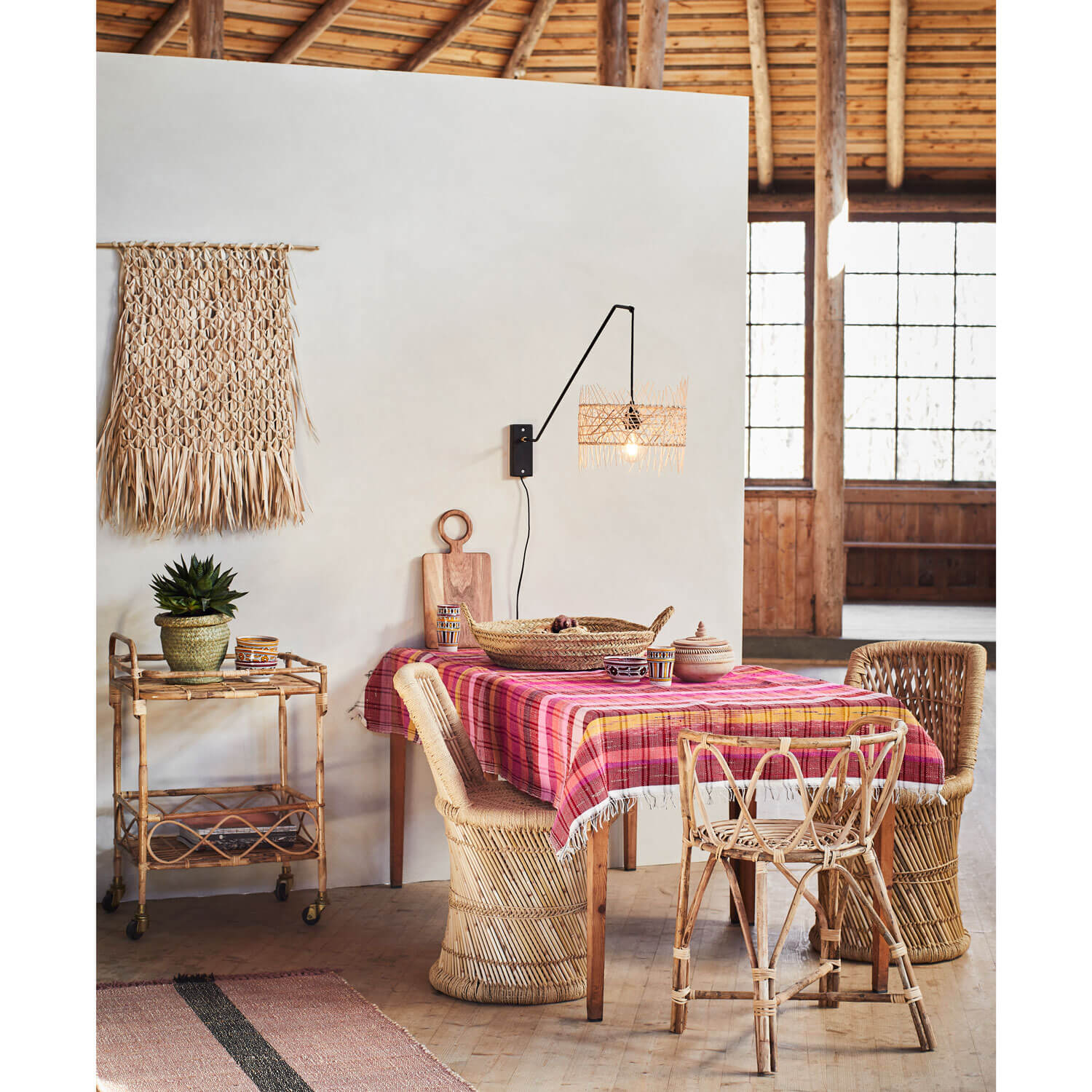 Die Wanddekoration ist aus naturbelassenen Blättern der Wasserhyazinthe geflochten und die unteren Enden hängen schlicht herab. Aufgefädelt auf einen Bambusstab kannst du den Wandbehang ganz leicht mit ein oder zwei Nägeln oder einem Haken an deiner Wand befestigen. Gleichfalls kannst du eine Schnur (z. B. aus Jute) nutzen, um diese schöne Dekoration aufzuhängen.