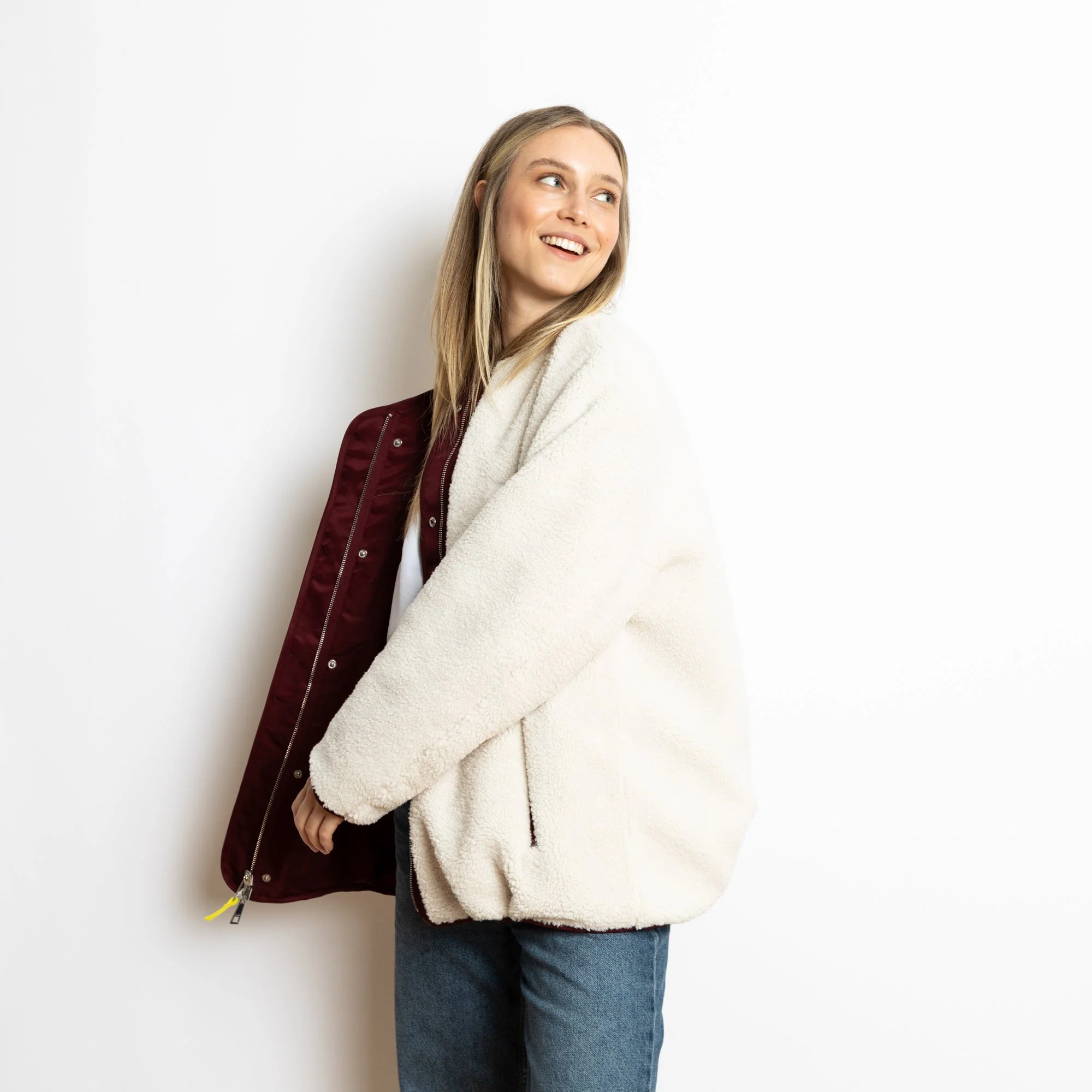 Durch den angesagten kastigen Oversize-Schnitt (Boxy Cut) bleibt immer genügend Platz für deinen kuscheligen Lieblingspulli. So bist du auch an kühleren Tagen nie zu kalt angezogen, kommst aber im Frühjahr oder Herbst nicht ins Schwitzen – denn du kannst jederzeit die wärmende Teddy-Seite nach außen tragen.